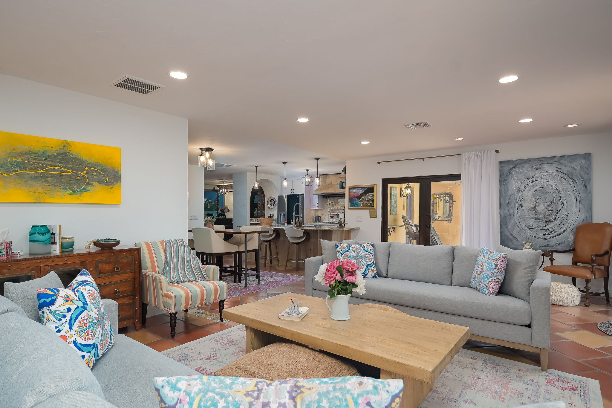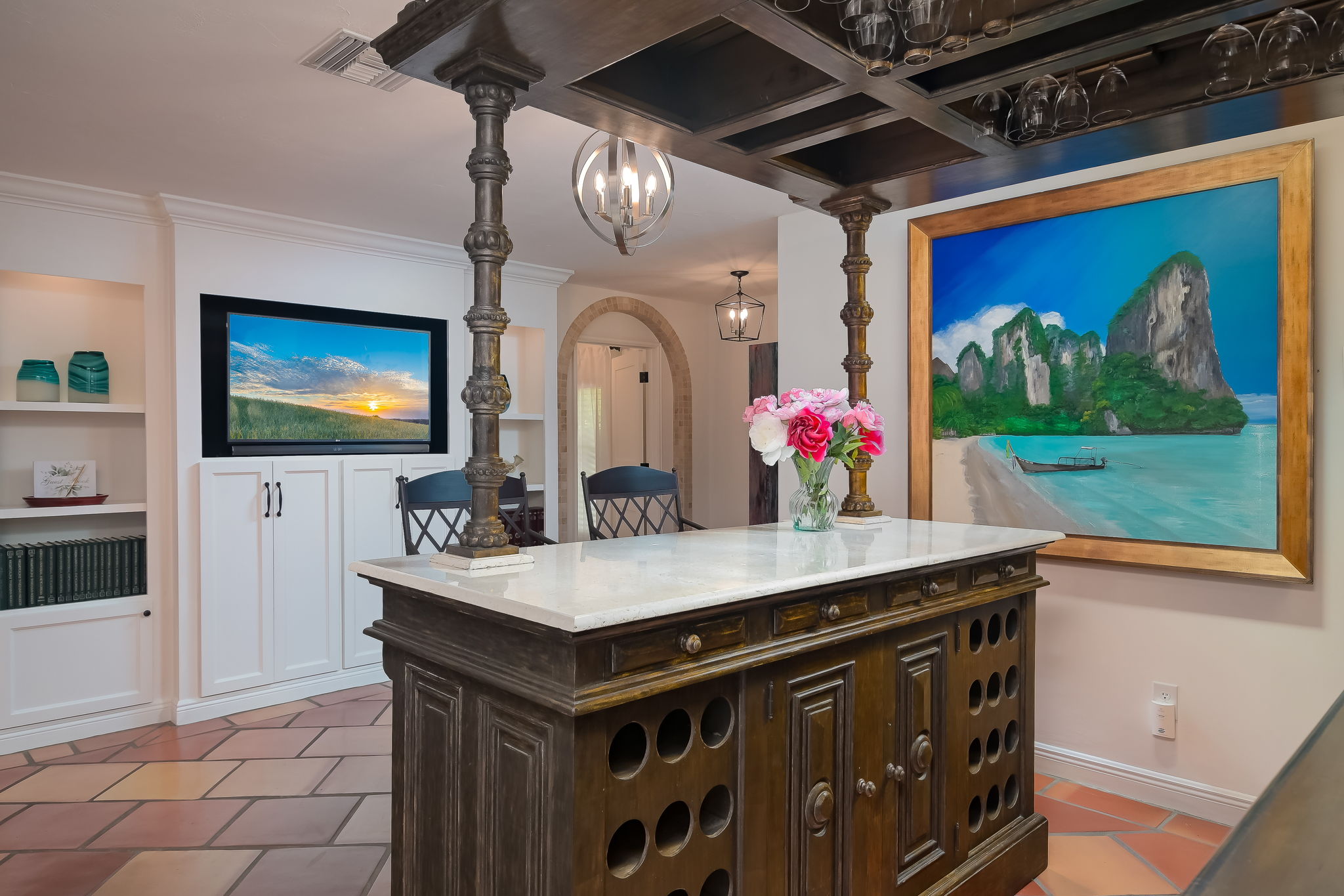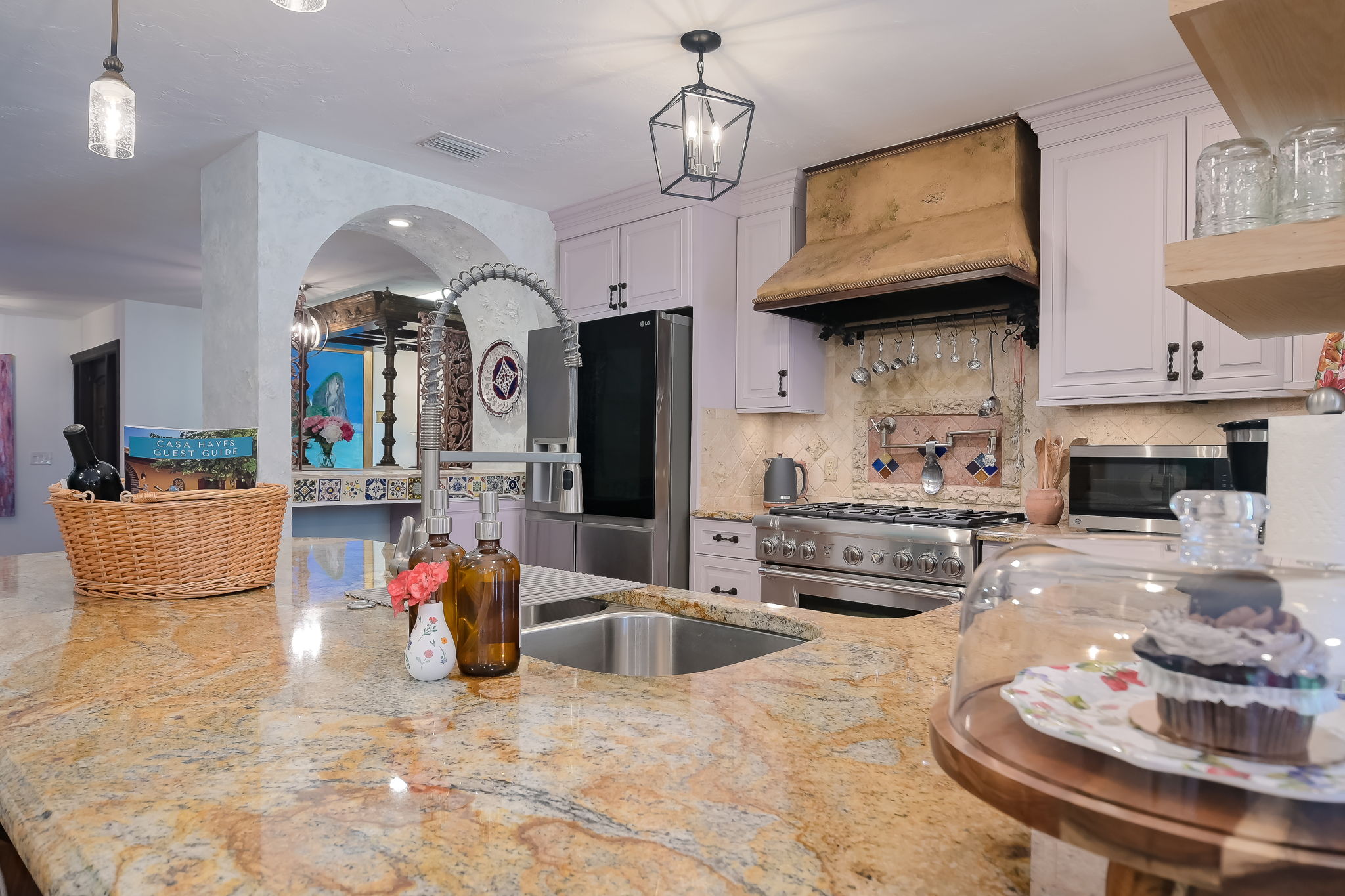 The Mediterranean-style gourmet kitchen is a chef’s dream, featuring an impressive Thermador gas stove. Gather with friends on the expansive tropical patio, where hundreds of solar and string lights create a magical ambiance as the sun sets. Raise a glass of champagne under the stars, or take a short 12-minute drive to explore the beach and the charm of Fifth Avenue.