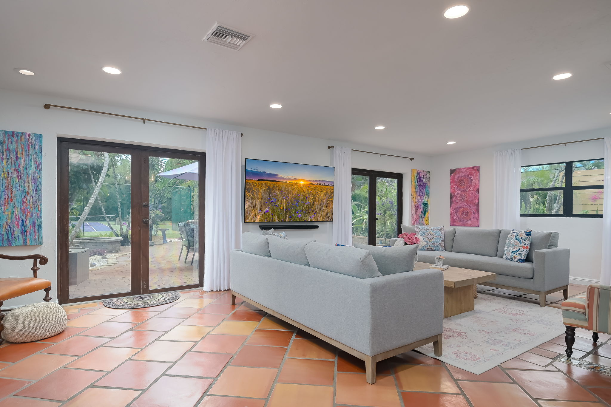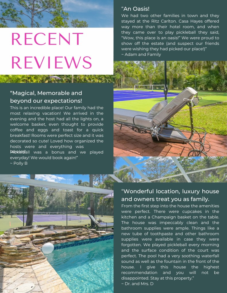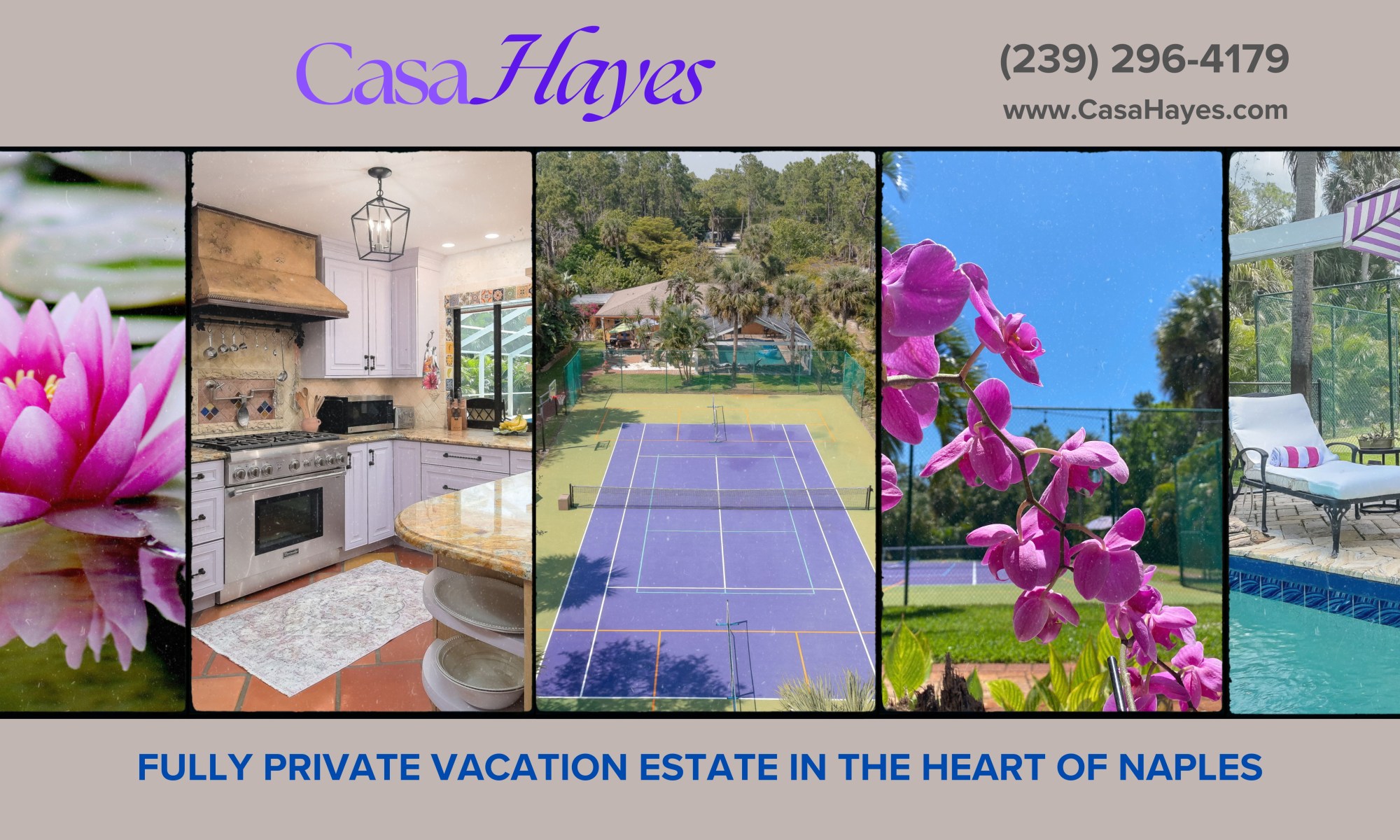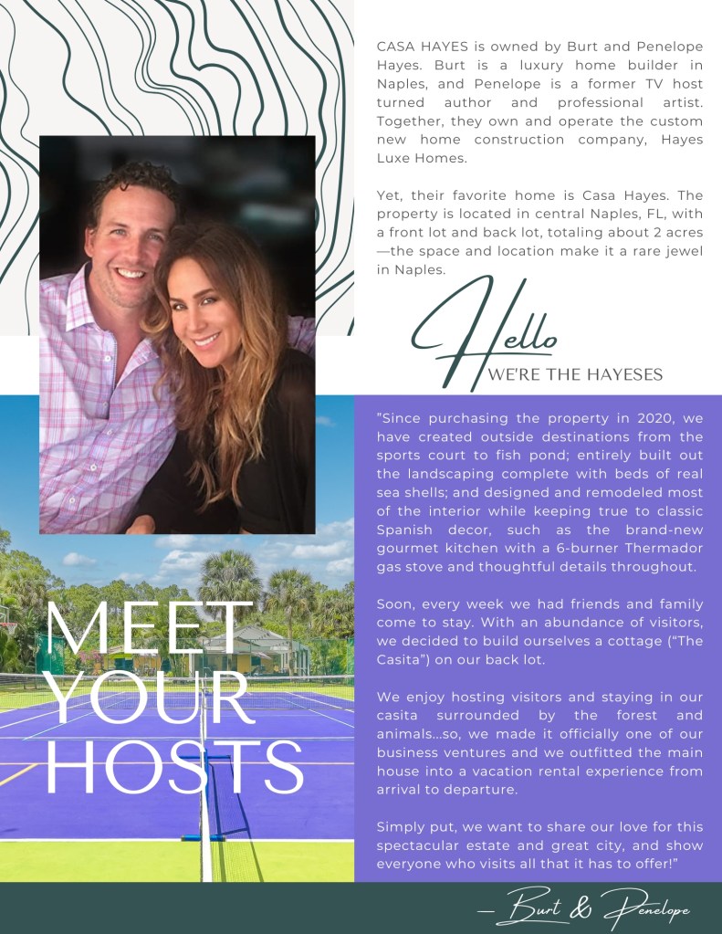 Discover tropical tranquility and luxury at Casa Hayes Estate, where Spanish-transitional design is infused with the vibrant colors of South Florida. This private retreat features an open-concept living space, a spacious king primary suite, a chic queen bedroom, and a designer bunk room with four built-in beds—comfortably accommodating up to 10 guests. Outside, your personal vacation paradise awaits, complete with a brand-new tennis court, two pickleball courts, a basketball hoop, a tranquil orchid garden with a cozy firepit on the patio, and a resort-style pool. The expansive, secluded grounds offer the ideal setting for both relaxation and recreation. Located just 12 minutes from Naples Beach, the iconic Pier, and the lively Fifth and Third Avenues, Casa Hayes effortlessly combines serenity with access to the best of the Naples scene.