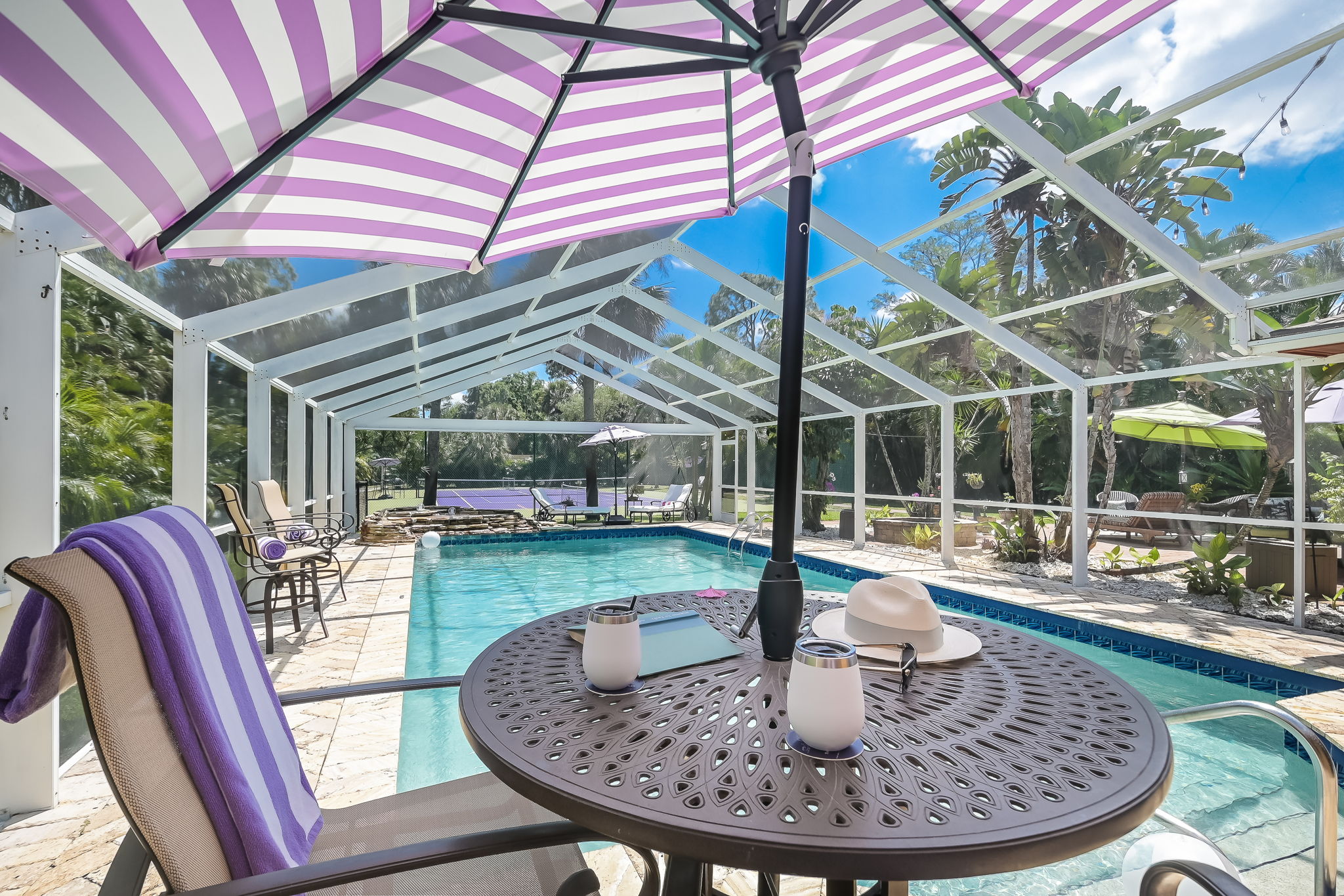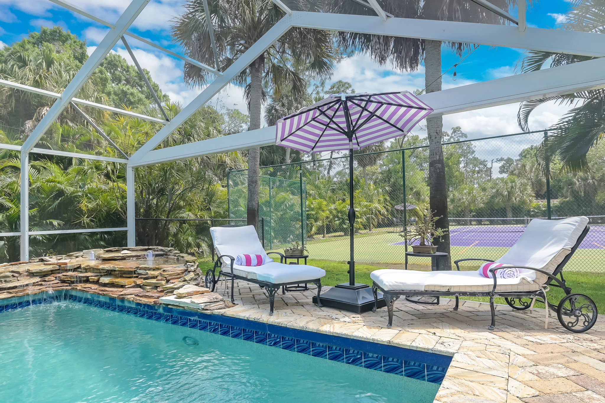 As one of Naples’ most extraordinary properties, this estate boasts an impressive array of amenities. Enjoy your days on the private sports court with tennis and pickleball facilities, or relax by the expansive resort-style pool, complete with a cascading waterfall. Have your morning coffee on the patio of the orchid garden; unwind in the lush acre+ property. Every detail has been carefully curated, from the waiting-for-you chaise lounges to the luxurious robes and slippers provided for each guest.